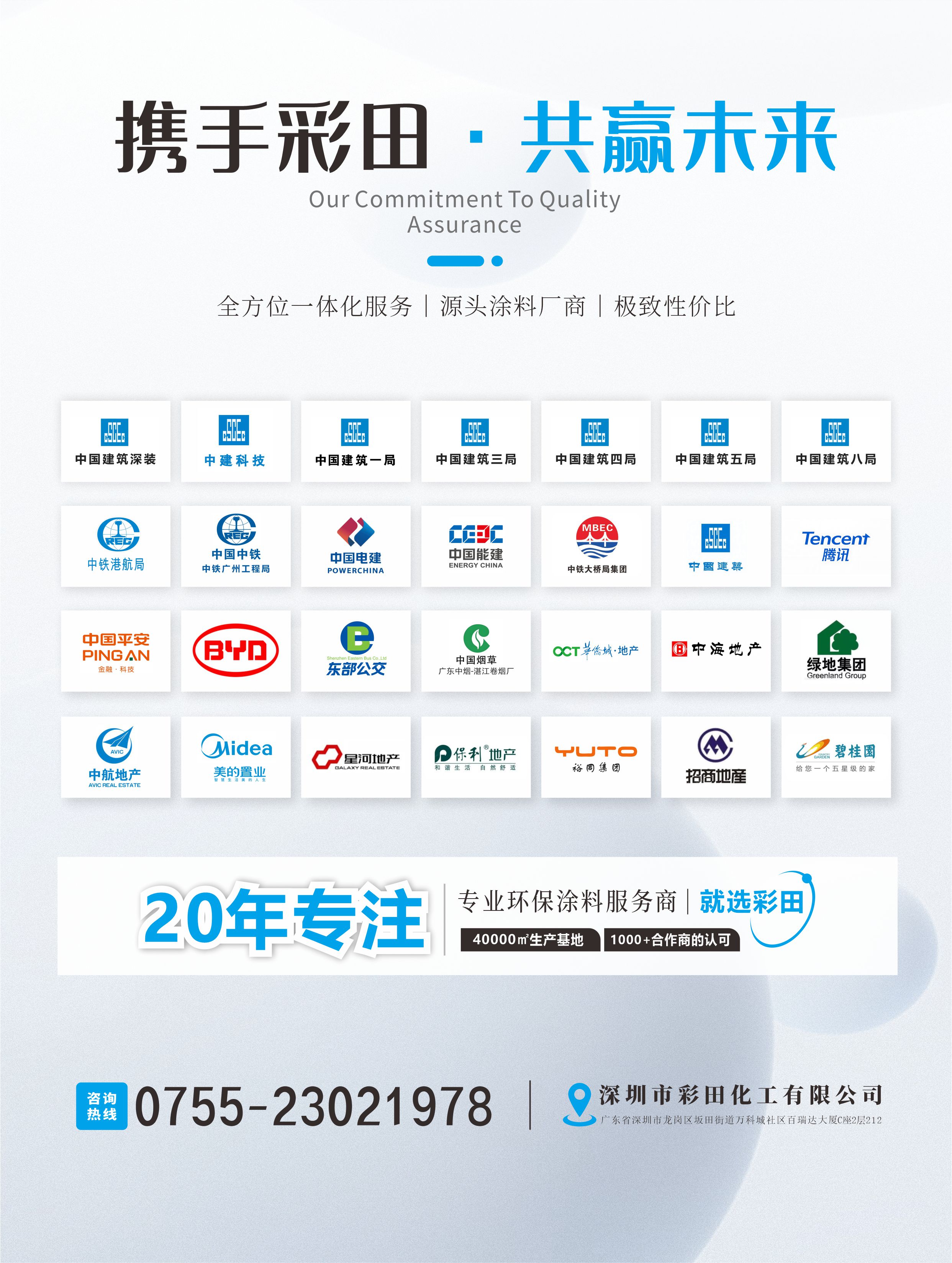 深圳市彩田化工有限公司(以下簡稱“彩田化工”)是國家高新技術企業,“專精特新”企業。彩田化工專注環保涂料領域20年,是集技術研發、生產、銷售、方案設計、施工服務為一體的建筑涂料服務商。彩田?是深圳市彩田化工有限公司旗下環保涂料品牌。彩田?始終秉持“技術研發創新,驅動綠色涂裝”的核心使命。在產品創新及應用方面,彩田?不斷革新產品研發技術, 產品的性能迭代,提供全鏈條配套服務,以滿足現代工業、商業等建筑涂裝領域的使用需求。彩田?從原材料合成到產品技術研發與生產,從一對一施工考察到定制化工程方案設計,從工程施工到完工質量把控,整體服務有保障。