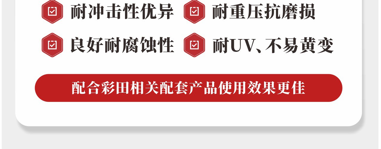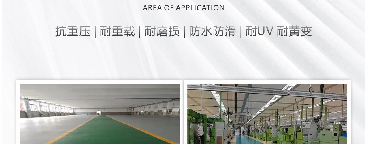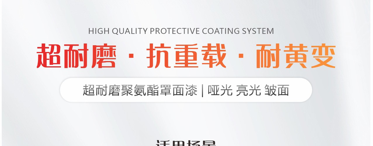 抗壓耐磨,脂肪族聚氨酯增強層涂料。高固含量;優異的耐磨損,抗沖擊性能;很好的耐 UV 性能,無黃變;可獲得紋理表面;很好的抗化學性能。